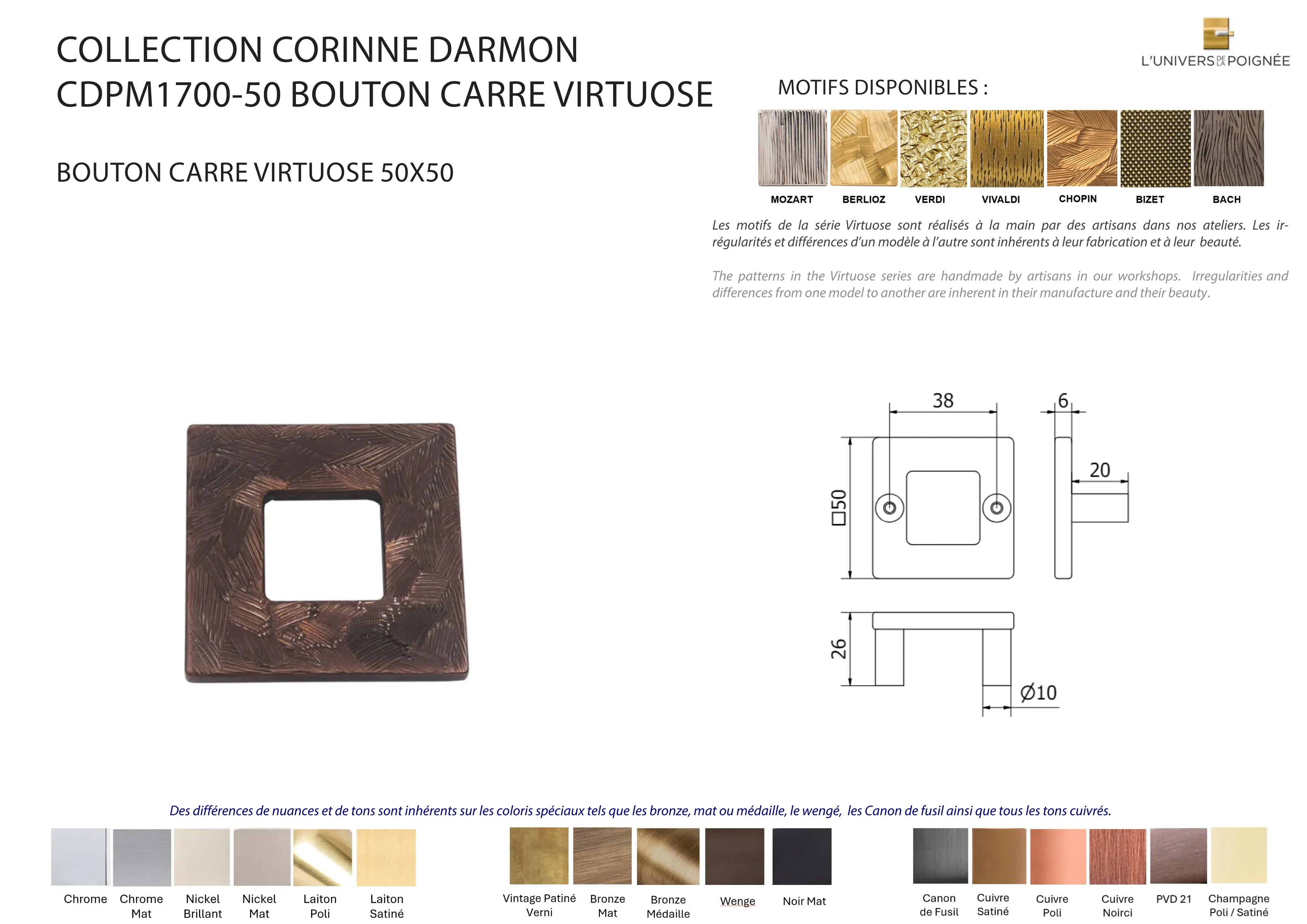 Laiton satiné ; Laiton poli ; Chrome mat ; Chrome brillant ; Nickel mat ; Nickel brillant ; Bronze mat ; Bronze médaille ; Bronze vintage ; Wengé ; Blanc ; Noir mat ; Canon de fusil ; Cuivre satiné ; Cuivre brillant ; Cuivre noirci ; Champagne mat ; Champagne brillant