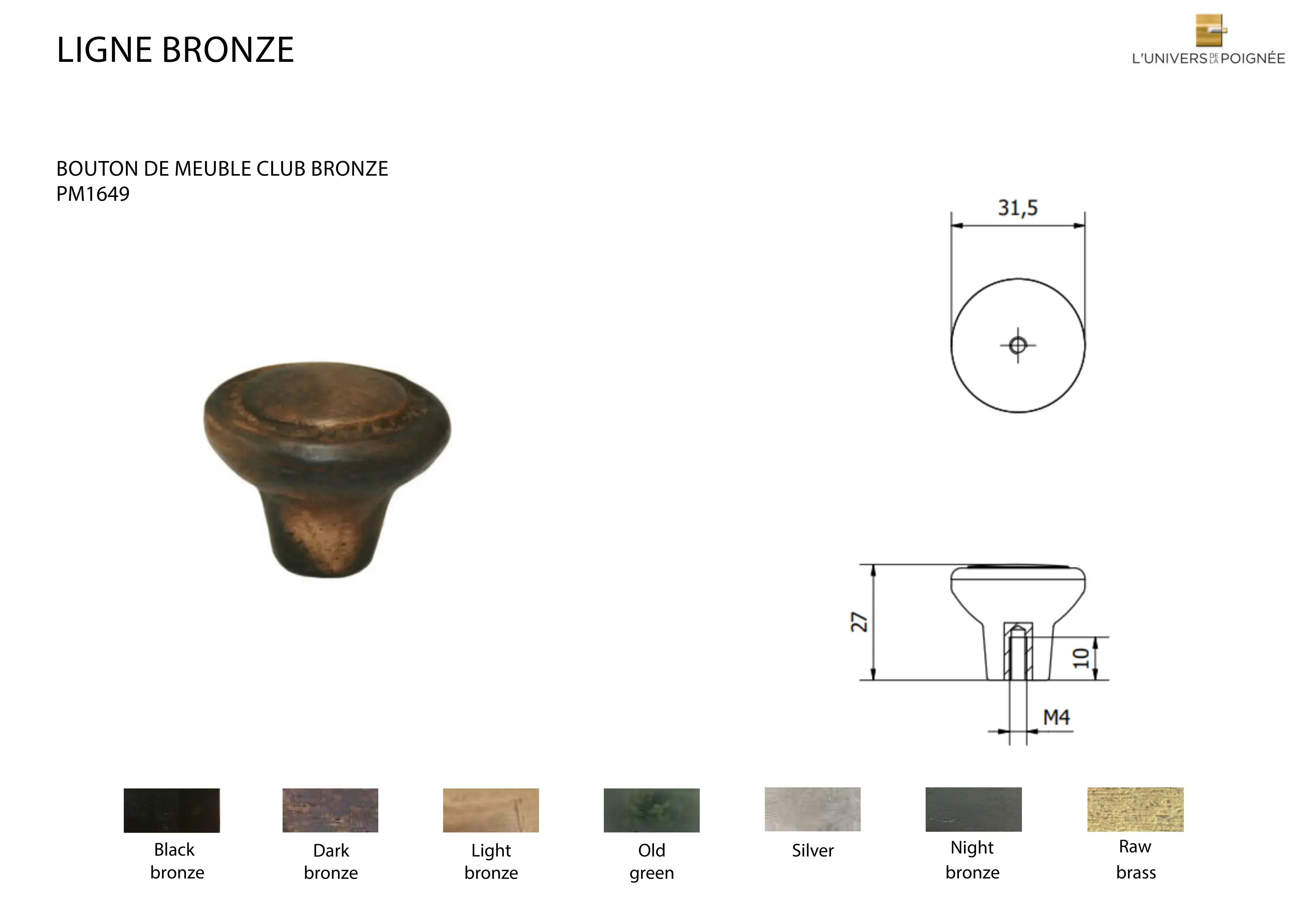 Les finitions disponibles incluent : Black bronze ; Dark Bronze ; Light Bronze ; Old Green ; Silver ; Night Bronze ; Old Brass ; Nickel Brillant