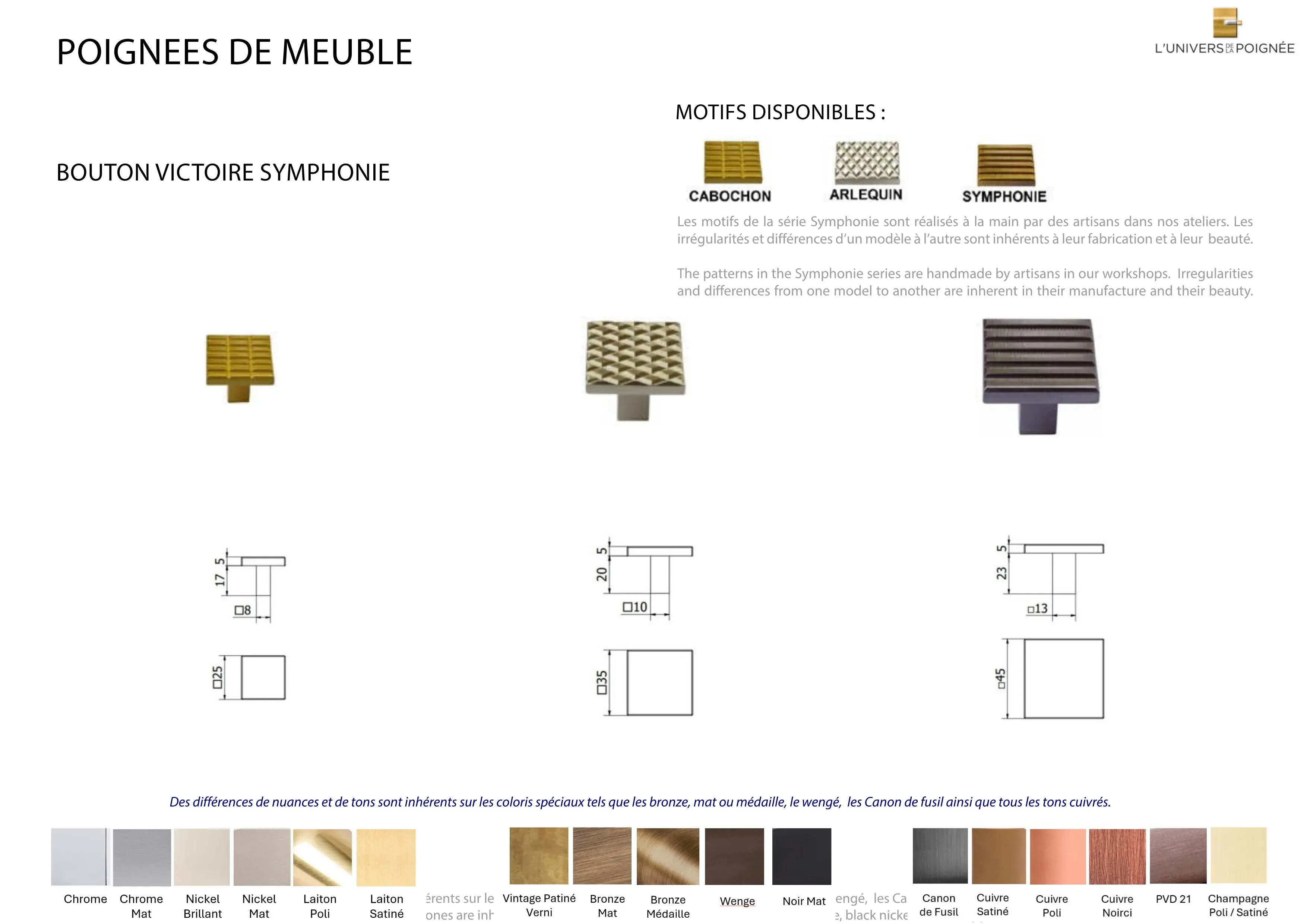 Parce que chaque intérieur mérite une finition sur mesure, le bouton de meuble Victoire est disponible en plus de 15 coloris différents, parmi lesquels : Laiton satiné ; Laiton poli ; Chrome mat ; Chrome brillant ; Nickel mat ; Nickel brillant ; Bronze mat ; Bronze médaille ; Bronze vintage ; Wengé ; Blanc ; Noir mat ; Canon de fusil ; Cuivre satiné ; Cuivre brillant ; Cuivre noirci ; Champagne mat ; Champagne brillant