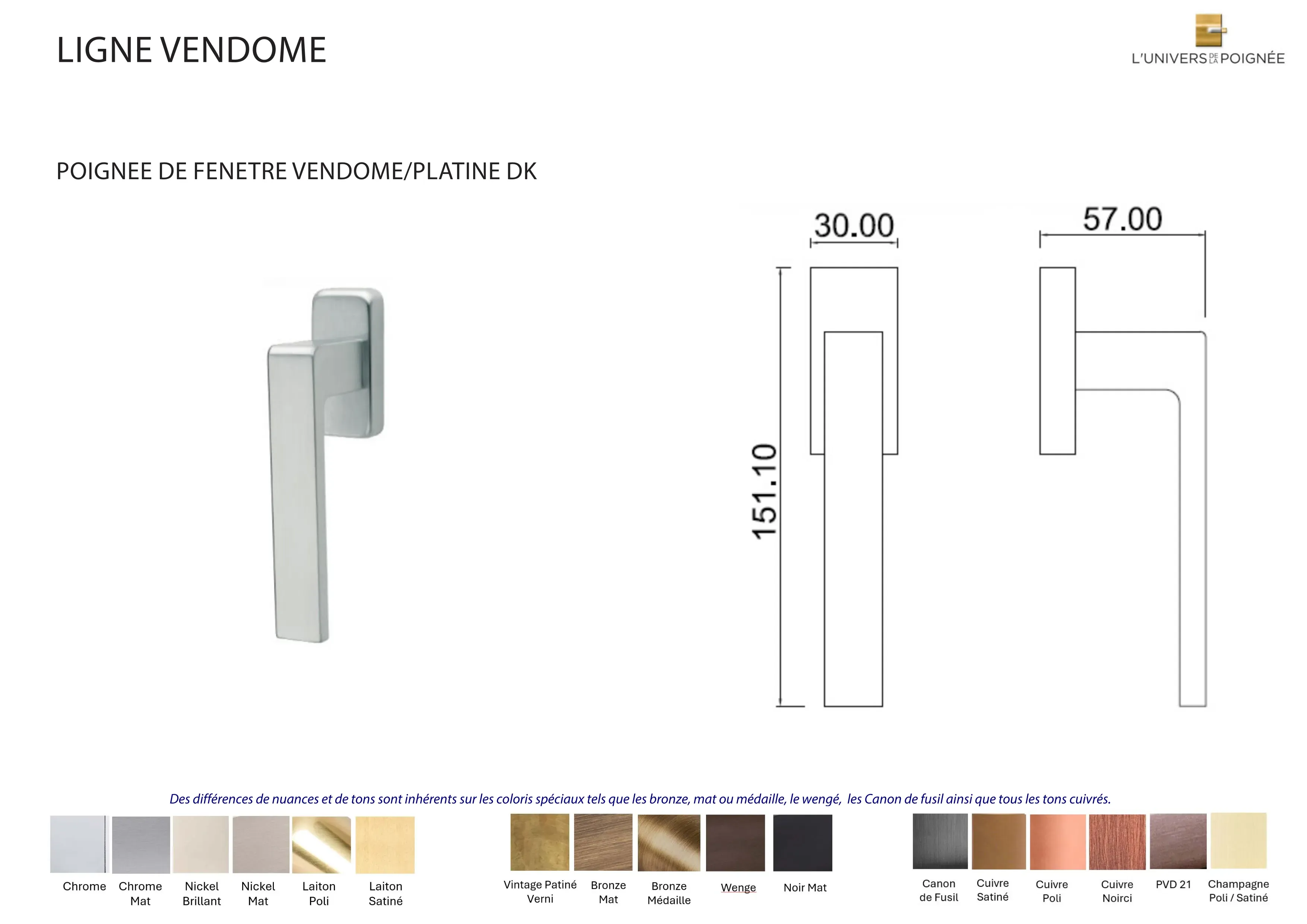 Parce que chaque intérieur mérite une finition sur mesure, la poignée de fenêtre Vendôme est disponible en plus de 15 coloris différents, parmi lesquels : Laiton satiné ; Laiton poli ; Chrome mat ; Chrome brillant ; Nickel mat ; Nickel brillant ; Bronze mat ; Bronze médaille ; Bronze vintage ; Wengé ; Blanc ; Noir mat ; Canon de fusil ; Cuivre satiné ; Cuivre brillant ; Cuivre noirci ; Champagne mat ; Champagne brillant
