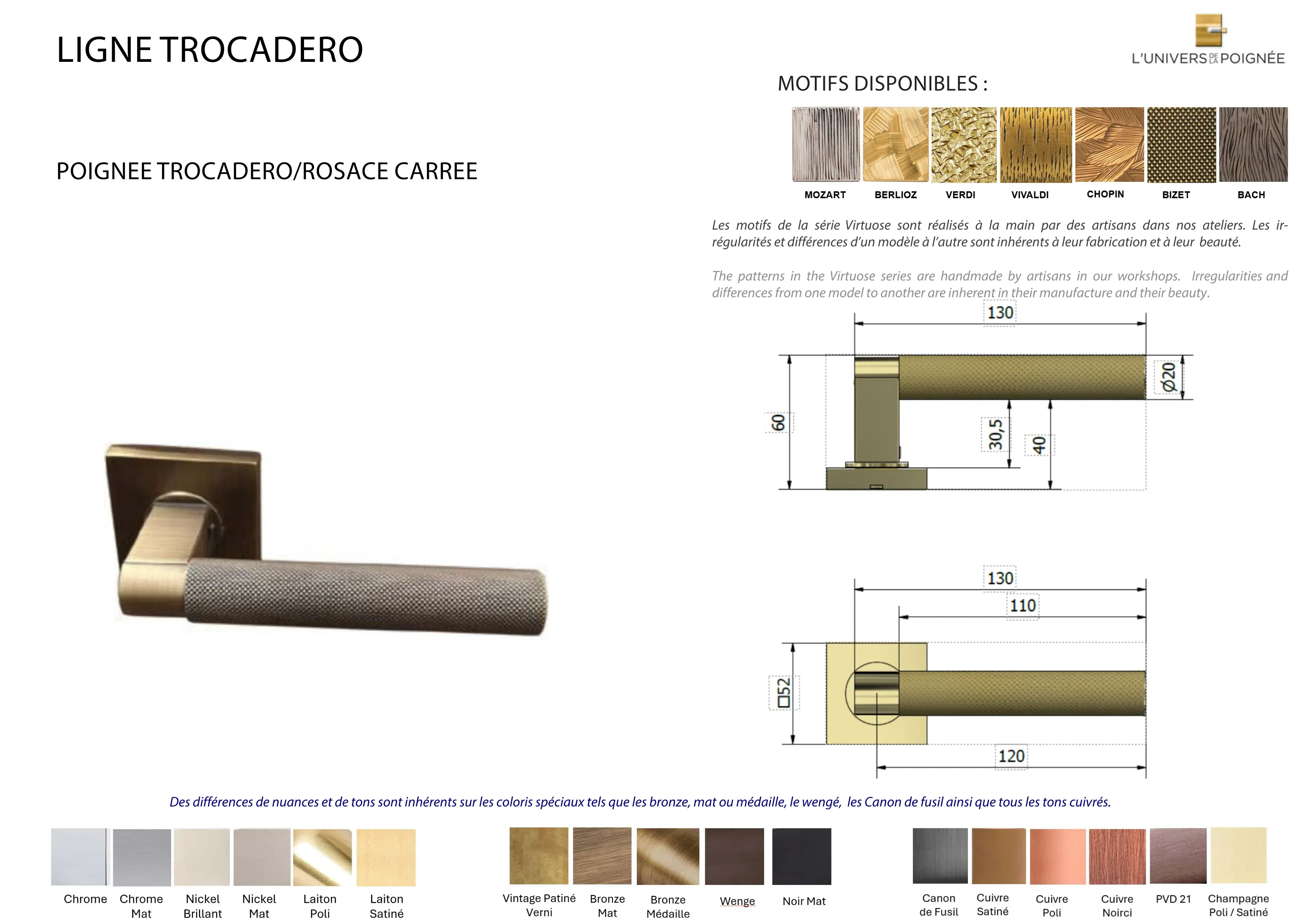 Parce que chaque poignée peut être une véritable pièce unique, la poignée Trocadéro peut être entièrement personnalisée. Grâce à un travail artisanal minutieux de gravure et de guillochage, elle peut être sublimée par des motifs exclusifs, renforçant son esthétique contemporaine et raffinée. Chaque finition est réalisée avec le plus grand soin, faisant de cette poignée un véritable bijou de quincaillerie.